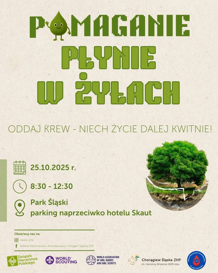 Już 25. października (sobota) zapraszamy na akcję krwiodawstwa w Parku Śląskim (naprzeciwko hotelu „Skaut”).