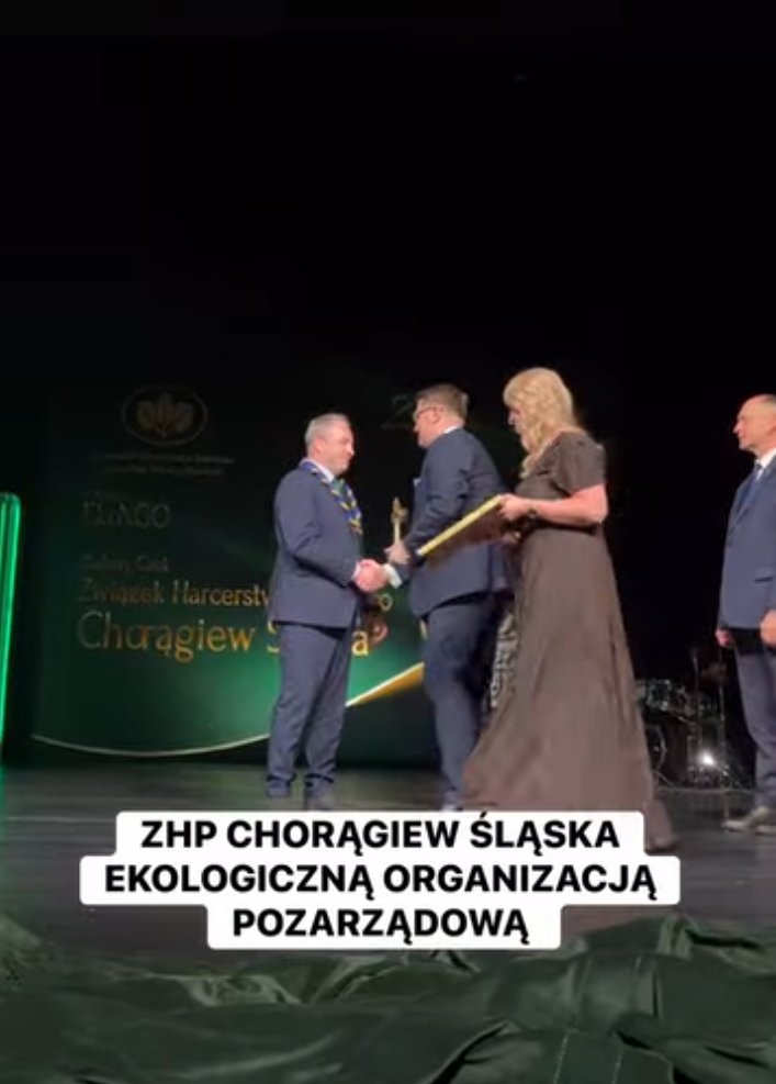 🏆Statuetkę w imieniu harcerek i harcerzy odebrał Komendant Chorągwi Śląskiej ZHP hm. Marcin Różycki. Nagrodę wręczył Prezes Zarządu Wojewódzkiego Funduszu Ochrony Środowiska i Gospodarki Wodnej w Katowicach, Mateusz Pindel.