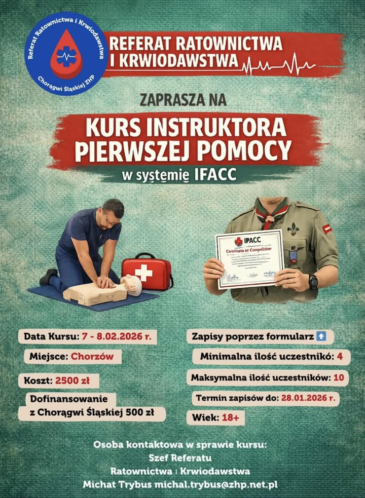 W razie pytań prosimy w sprawie kursu prosimy o kontakt z Szefem Referatu Ratownictwa i Krwiodawstwa druhem Michałem Trybusem, adres e-mail: [email protected]