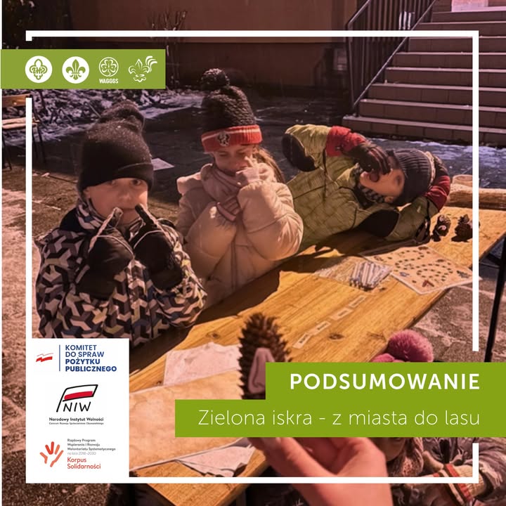 Zielona Iskra – z miasta do lasu 🌳🍃 – zuchy uczestniczyły w zajęciach przyrodniczych, poznając lokalne lasy i zdobywając sprawność Super Wzroku. Projekt rozwijał wrażliwość ekologiczną, kreatywność oraz budował więzi z lokalną społecznością poprzez działania twórcze i rozmowy z mieszkańcami.