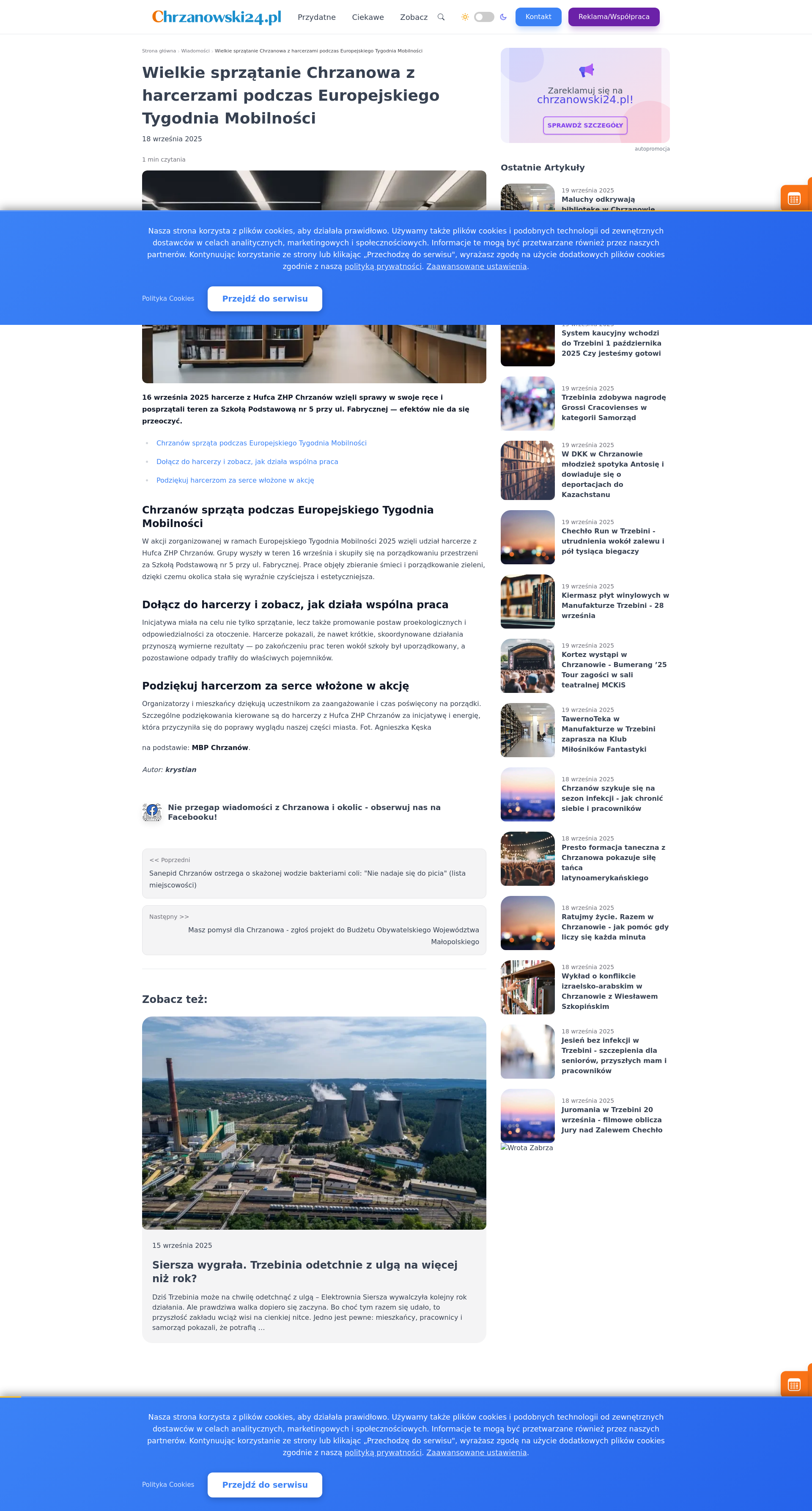 W akcji zorganizowanej w ramach Europejskiego Tygodnia Mobilności 2025 wzięli udział harcerze z Hufca ZHP Chrzanów. Grupy wyszły w teren 16 września i skupiły się na porządkowaniu przestrzeni za Szkołą Podstawową nr 5 przy ul. Fabrycznej. Prace objęły zbieranie śmieci i porządkowanie zieleni, dzięki czemu okolica stała się wyraźnie czyściejsza i estetyczniejsza.