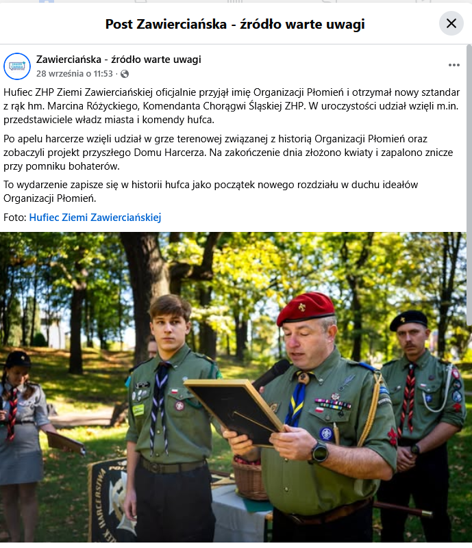 Hufiec ZHP Ziemi Zawierciańskiej oficjalnie przyjął imię Organizacji Płomień i otrzymał nowy sztandar z rąk hm. Marcina Różyckiego, Komendanta Chorągwi Śląskiej ZHP. W uroczystości udział wzięli m.in. przedstawiciele władz miasta i komendy hufca.
