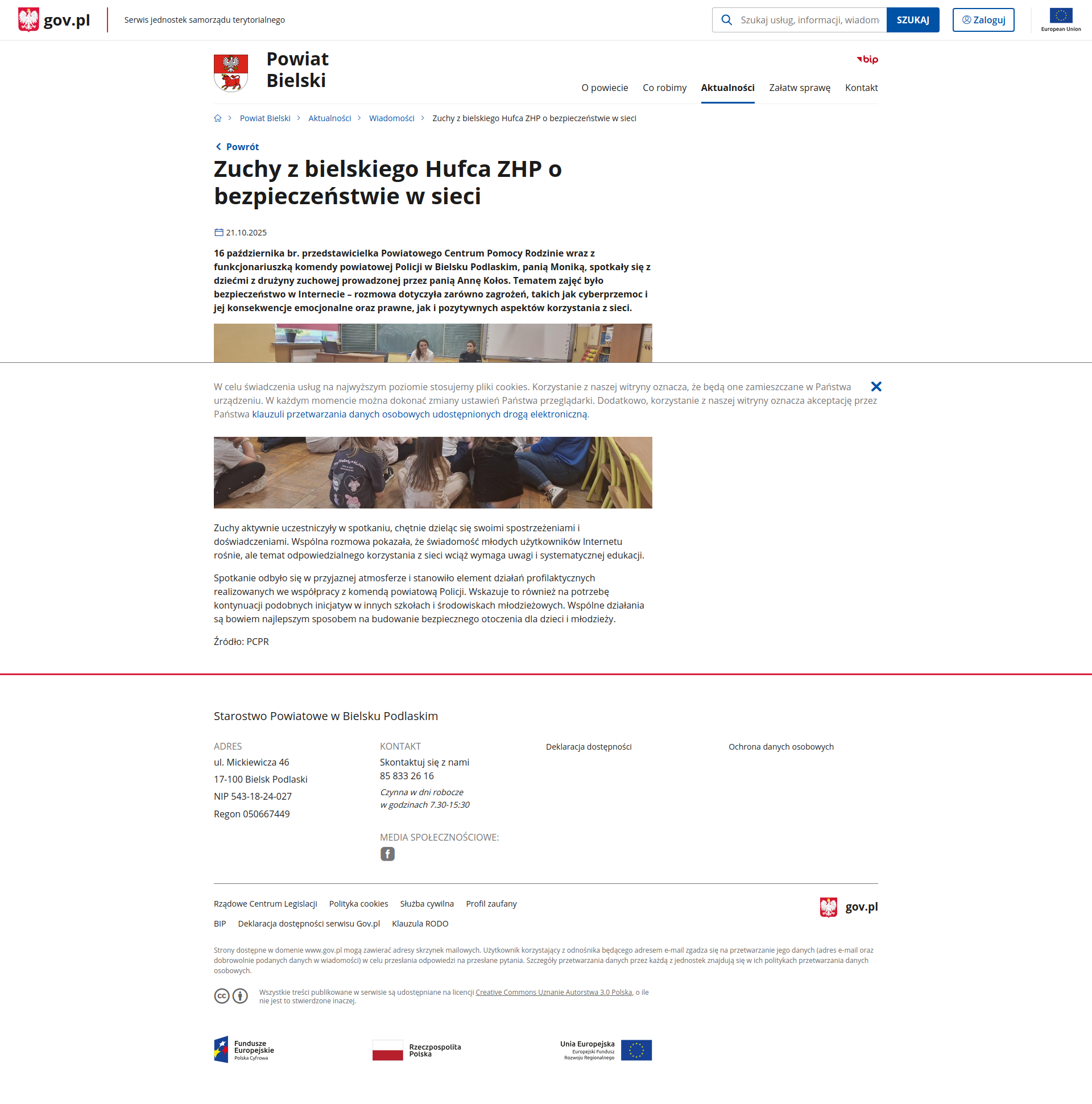 16 października br. przedstawicielka Powiatowego Centrum Pomocy Rodzinie wraz z funkcjonariuszką komendy powiatowej Policji w Bielsku Podlaskim, panią Moniką, spotkały się z dziećmi z drużyny zuchowej prowadzonej przez panią Annę Kołos. Tematem zajęć było bezpieczeństwo w Internecie – rozmowa dotyczyła zarówno zagrożeń, takich jak cyberprzemoc i jej konsekwencje emocjonalne oraz prawne, jak i pozytywnych aspektów korzystania z sieci.