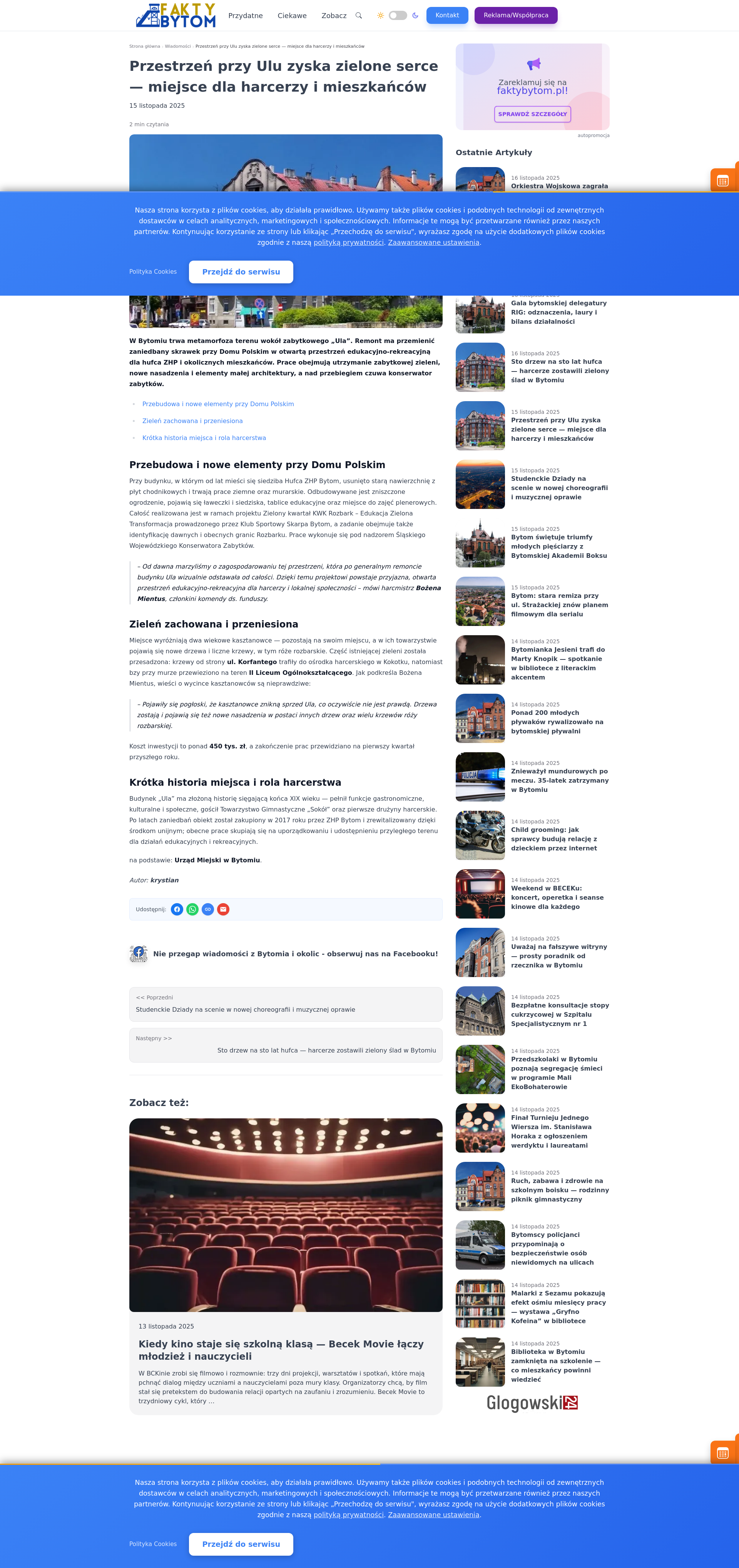W Bytomiu trwa metamorfoza terenu wokół zabytkowego „Ula”. Remont ma przemienić zaniedbany skrawek przy Domu Polskim w otwartą przestrzeń edukacyjno-rekreacyjną dla hufca ZHP i okolicznych mieszkańców. Prace obejmują utrzymanie zabytkowej zieleni, nowe nasadzenia i elementy małej architektury, a nad przebiegiem czuwa konserwator zabytków.