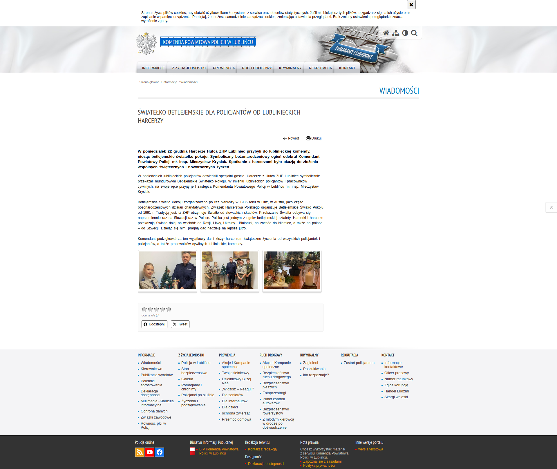 W poniedziałek 22 grudnia Harcerze Hufca ZHP Lubliniec przybyli do lublinieckiej komendy, niosąc betlejemskie światełko pokoju. Symboliczny bożonarodzeniowy ogień odebrał Komendant Powiatowy Policji mł. insp. Mieczysław Krysiak. Spotkanie z harcerzami było okazją do złożenia wspólnych świątecznych i noworocznych życzeń.