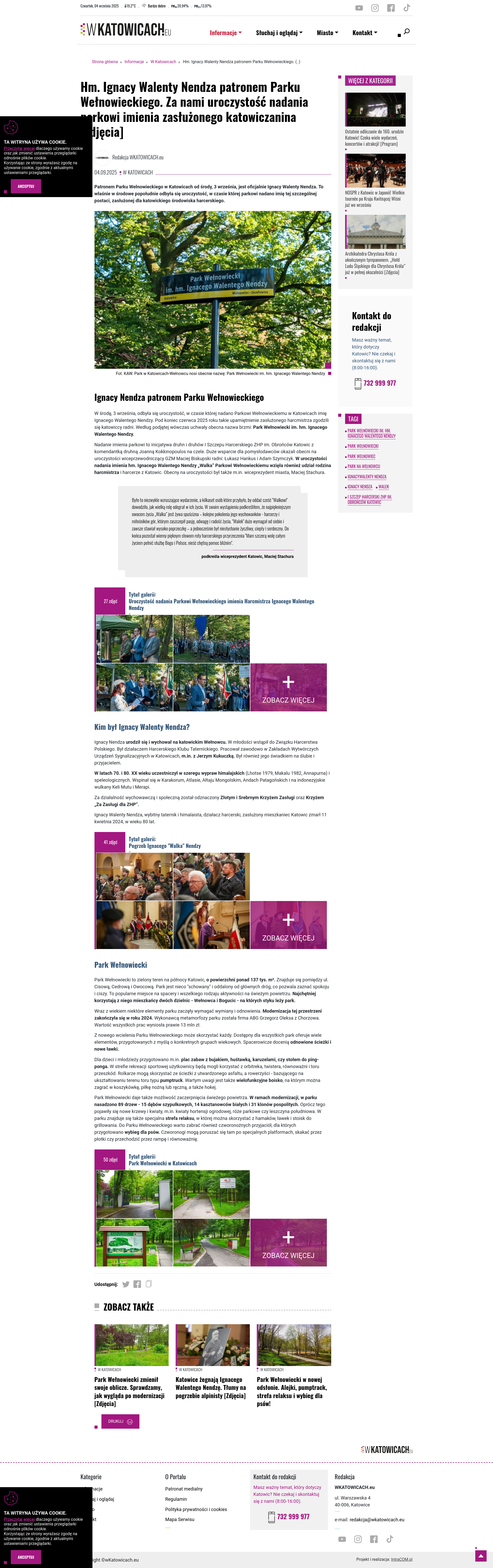 W środę, 3 września, odbyła się uroczystość, w czasie której nadano Parkowi Wełnowieckiemu w Katowicach imię Ignacego Walentego Nendzy. Pod koniec czerwca 2025 roku takie upamiętnienie zasłużonego harcmistrza zgodzili się katowiccy radni. Według podjętej wówczas uchwały obecna nazwa brzmi: Park Wełnowiecki im. hm. Ignacego Walentego Nendzy.