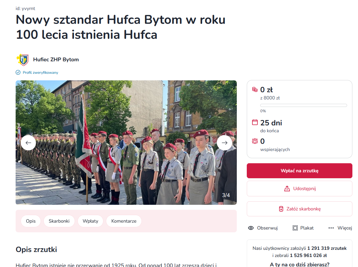 Hufiec Bytom istnieje nie przerwanie od 1925 roku. Od ponad 100 lat zrzesza dzieci i młodzież z Bytomia i Radzionkowa. Hufiec jest aktywną jednostką organizacji pozarządowych działających na terenie wymienionych miast. Bierzemy udział w uroczystościach miejskich, patriotycznych, religijnych, kulturalno- rozrywkowych i sportowych. Ważnym w obrzędowości naszego Hufca elementem jest sztandar, który z dumą reprezentuje naszą jednostkę przy wszystkich oficjalnych uroczystościach. Czas pozostawił na nim swój ślad. Dziś już z pełną odpowiedzialnością możemy powiedzieć, że zasłużył on na odpoczynek i ekspozycję w Bytomskiej Izbie Pamięci w harcerskiej siedzibie Domu Polskim „UL”. W Jubileuszowym roku 100 lecia działalności Bytomskiego Hufca pragniemy wspólnymi siłami zebrać środki i zakupić nowy sztandar, który będzie dla Nas jako całej społeczności harcerskiej największym wyróżnieniem. Zachęcamy do wsparcia Nas w tym celu. Zachęcamy do wpłaty naszych sympatyków, instruktorów i wszystkich którzy chcieliby dołożyć symboliczną cegiełkę do tego celu. Fundatorzy, którzy zechcą wpłacić kwotę 300,00zł i więcej zostaną uhonorowani specjalnymi gwoździami dla fundatorów, które zostaną wbite w nowy drzewiec sztandaru w dniu jego nadania. Dla pozostałych darczyńców przekażemy pamiątkowy dyplom z podziękowaniem.
