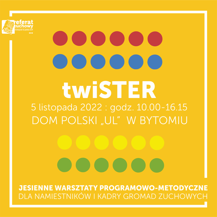 Referat Zuchowy Chorągwi Śląskiej ZHP serdecznie zaprasza namiestników oraz kadrę gromad zuchowych na Jesienne warsztaty programowo-metodyczne „TWISTER”, które odbędą się 5 listopada 2022 roku (sobota) w godz. 10.00-16.15 w Domu Polskim „Ul” w Bytomiu.