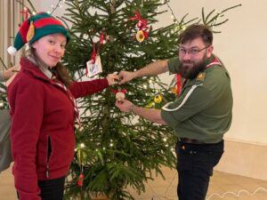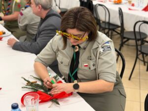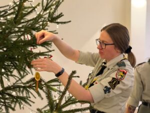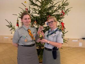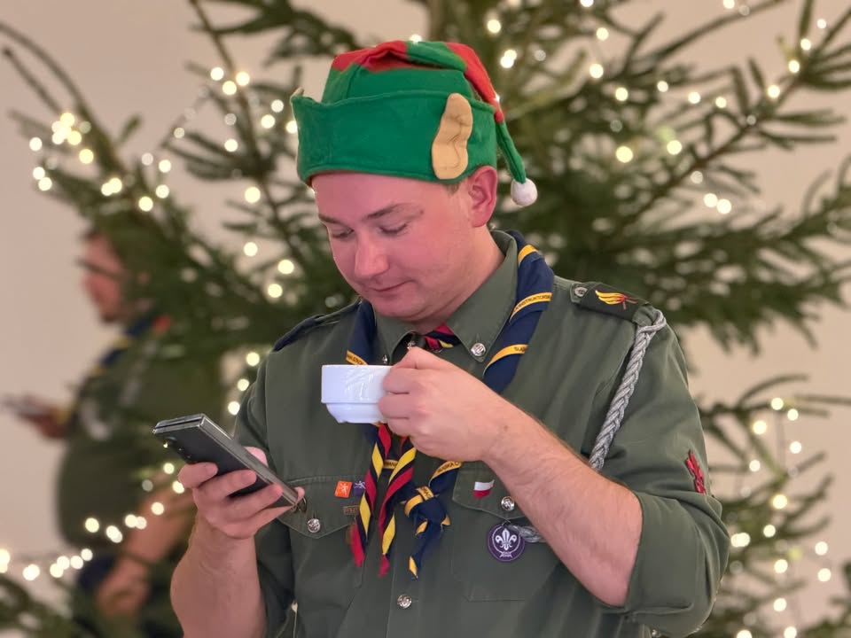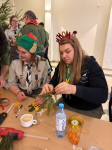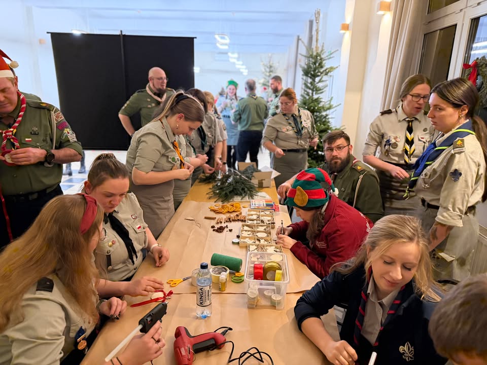 Po części oficjalnej nadszedł czas na to, co buduje naszą wspólnotę – bycie razem. Przełamaliśmy się opłatkiem, składając sobie życzenia na nadchodzący rok, a przedstawiciele hufców podzielili się ciepłymi słowami. Nie zabrakło też twórczego akcentu: wspólnie ozdabialiśmy choinkę własnoręcznie przygotowanymi ozdobami, co wprowadziło nas w prawdziwie świąteczny nastrój.